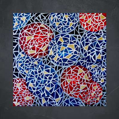 Tableau inspiré suite à un voyage à Barcelone et visite (entre autre) de la Sagrada Familia en haut de laquelle quelques flêches possèdent des boules et ce genre de mosaïque.