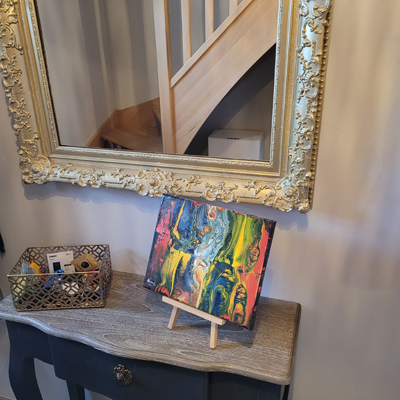 Les bords du tableau sont peints ce qui permet un accrochage sans cadre. (même si un cadre comme une caisse américaine le mettra en valeur)