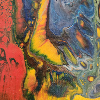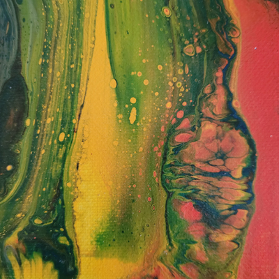 Le nom m'est venu après l'avoir fini, mais je ne sais pas trop pourquoi je l'ai appelé "Alien", si ce n'est quà cette période, je donnais des noms de films à mes tableaux. Peut-être aussi parceque suivant comment on le regarde, on peut voir une sorte de crâne en partie supérieure et une bouche avec une coulure (partie joune au centre droit ): Alien !