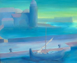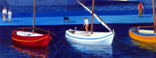 * Dans mon tableau Collioure (deuxième version à l‘Acrylique), le "personnage" le plus important n'est pas visible. Tous les autres sont là pour détourner votre attention des vrais signes, des choses réellement importantes (un peu comme dans la vie). Le pèlerin à droite, lui, regarde loin, au-delà de l'horizon, il est déjà ailleurs, cet ailleurs qui l'appelle. La femme et l'enfant, eux, admirent la chapelle de Collioure, même si la femme, qui se hausse sur la pointe des pieds, semble regarder quelque chose par-delà le parapet. Le matelot, lui, est insensible à tout cela. Collioure c'est son univers. Il connaît chaque coin et recoin du village et de la côte Catalane. Est-il blasé ? Aujourd'hui, il va prendre la mer, et sa préoccupation première est la préparation de son bateau. Le chien, lui, regarde dans l'autre bateau (vide du point de vue du spectateur que nous sommes). Que regarde t-il de manière si insistante, prêt à bondir ? sans doute un chat qui s'est blotti dans les filets ou les voiles encore enroulées. Le chat, c'est l'être invisible, le signe que seul l'initié peut voir ou imaginer en regardant le chien. C'est lui, celui qu'on ne voit pas. Il nous rappelle que parfois, les choses les plus importantes sont cachées à notre premier regard. Il faut donc toujours prendre du recul, et regarder autour de soi, si le chat n'est pas là…